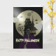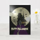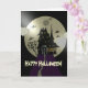 Wish a loved one a happy halloween with this cool hand-illustrated greeting card, complete with a drawing of a creepy haunted house on a hill in front of a huge full moon complete with bats and cats.
