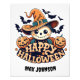 In the foreground, a mischievous black cat with glowing yellow eyes perches on a jack-o'-lantern, its arched back conveying a sense of playful mischief. The pumpkin grins wickedly, its carved face sending shivers down your spine. Surrounding the scene are swirling tendrils of fog, adding an extra touch of otherworldly enchantment.