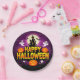 Serve up some spooky fun at your next gathering with these festive Halloween paper plates! The bold, cartoon-style design features a haunted house silhouetted against a full moon, surrounded by all the classic Halloween icons. A row of grinning jack-o'-lanterns, cute flying ghosts, mischievous witches, and black cats decorate the scene, all under a "Happy Halloween" message. These durable paper plates are the perfect party supply for serving treats and snacks to your guests, making cleanup quick and easy so you can focus on the fun!