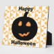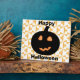 A festive, smiling Happy Halloween pumpkin sits atop a custom digitally designed pattern of streaming abstract pinwheel shapes.