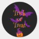 Get ready for Halloween with this spooktacular sticker! This eye-catching sticker features a carved pumpkin wearing a witch hat, accompanied by flying purple bats. It is is perfect to personalise your Halloween party gift bags.