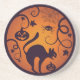 Happy Halloween circle badge with jack-o'-lantern black cat and bats typography
