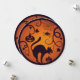 Happy Halloween circle badge with jack-o'-lantern black cat and bats typography