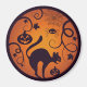 Happy Halloween circle badge with jack-o'-lantern black cat and bats typography