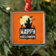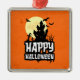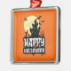 Happy Halloween text design illustration with haunted house, cemetery and bats decoration at full moon on grunge orange background