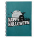 Happy Halloween text design illustration with cemetery and bats decoration at full moon on grunge blue background