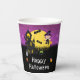 This fun and spooky paper cup features a cute witch beside a crooked haunted house. In the background is a full moon with bats and a purple night sky with stars. This is perfect for Halloween.