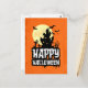 Happy Halloween text design illustration with haunted house, cemetery and bats decoration at full moon on grunge orange background