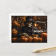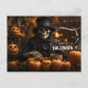 Vintage skeleton with a bicycle among cute Halloween pumpkins and lanterns. Happy Halloween Postcard