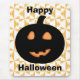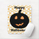 Happy Halloween jack-o-lantern sits atop a custom digitally designed pattern of streaming abstract pinwheel shapes.