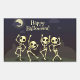A cartoon illustration of four skeletons dancing in a graveyard under a full moon, with the text "Happy Halloween!" at the top. The skeletons are depicted in a playful and lively manner, with their arms raised and legs moving as if they are dancing. The graveyard setting includes tombstones and a dark, moody sky, which adds to the Halloween theme. The overall style is simple and cartoonish, with clean lines and a limited colour palette.