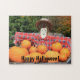 Add a holiday themed puzzle to your laid back evening of fun with this cute scarecrow that is sitting with his harvest of pumpkins. Fun for the whole family on a lazy weekend afternoon. Enjoy putting together this family fun time puzzle that shows a colourful pumpkin patch harvest and scarecrow when fully assembled. Customise the "Happy Halloween!" with any text you would like or leave it as is.