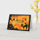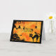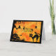 A Happy Halloween greeting with a menageries of halloween characters and creatures in a black silhouette on a mottled orange background. You can see scary pumpkin jack o lanterns and kitty cats with back arched and a spooky owl and creepy spider hanging around an old craggy tree.
