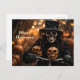 Skeleton in a vintage tuxedo and hat with modern bicycleand halloween decorations. Happy Halloween Postcard