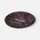 Delightful smiling jack o lantern pumpkins on a deep purple bokeh background, Happy Halloween greeting in white Halloween font and name in neon green decorate these 7" round paper plates. Easily make text changes using the Template provided. Ideal for Halloween party or small October gathering. Also available in 9" paper plate or 7" bowl. Sold in sets of 8 and printed on durable paper stock. See "About This Product" at side for more information.