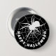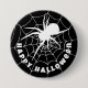 Happy Halloween spooky black and white spider crawling on a cobweb button badge. The text is customisable so you can add your own message