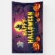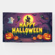 Get your space ready for some spooky fun with this adorable Halloween banner! This vibrant design features a playful, cartoon-style haunted house and a graveyard silhouetted against a glowing full moon. A row of grinning jack-o'-lanterns, a friendly ghost, and mischievous black cats on broomsticks fill the scene, all under a "Happy Halloween" message in a dripping, festive font. This banner is the perfect decoration for a Halloween party, a fun backdrop for trick-or-treating, or a great way to add a celebratory touch to your home or event.