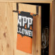 Happy Halloween text design illustration with haunted house, cemetery and bats decoration at full moon on grunge orange background