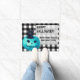 This cute Happy Halloween doormat has a teal pumpkin image and a message about non-food treats for kids with food allergies. The black and white buffalo plaid background gives a cute country farmhouse feel. Greet trick or treaters with a welcome mat that lets them know they can find allergy-friendly treats at your house.