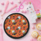 Happy Halloween paper plate featuring a smiling vampire bat with fangs, full moon and flying bats.