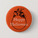 Happy Halloween witch button. It is Orange and black Happy Halloween with a screeching black cat can be customised to add names, text, or sayings. Click "customise it" to add yours. It is great for fun Halloween gifts and treats!