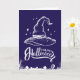 This striking Halloween Greeting Card features a bold, white illustration of a classic witch hat set against a deep purple background. The design is completed with a spooky graveyard scene at the bottom, adding an eerie yet stylish touch. The "Happy Halloween" message is elegantly scripted, making this Greeting Card perfect for sending Halloween greetings or for use as a decorative piece during the spooky season. The minimalist yet impactful design is ideal for those who appreciate a classic Halloween aesthetic.