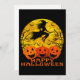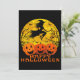 Funny Happy Halloween Witch On Broom With These Cute Smiling Pumpkin Behind The Yellow Bright Moonlight With Flying Bats And Silhouette Trees And Lady Witch. Invite Your Friend For Your Halloween Party.