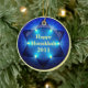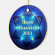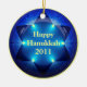 A bright, unique Hanukkah ornament with the Star of David and illuminated lights on a blue background with "Happy Hanukkah 2011" written on both sides in light yellow text. Easily change the text or delete it if not needed. The image design is on one side on this beautiful ceramic ornament that is shown and the other side is blank. This ornament version has the look of a 3d glossy glass ball! The perfect Hanukkah keepsake for 2011!