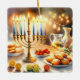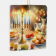 Hanukkah watercolor illustration. A beautifully arranged table set for a festive celebration, featuring a traditional menorah with lit candles. Soft, warm light, while holiday decorations add a touch of cheer. Warm lights creating a cosy, inviting atmosphere.