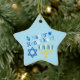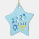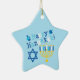 Happy Hanukkah text with a menorah, Star of David and two dreidels. Shades of blue, white and yellow.