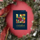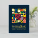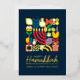 Happy Hanukkah / Chanukah Modern Geometric Holiday Greetings in Real Gold Foil on Dark Navy. Menorah, Dreidel, Doughnuts, Stars & Olive oil... They are all here. Jewish Hanukkah Symbols + Space to add your personalised text on the front & reverse. Hebrew on the reverse says, "Chanukah Sameach" — Happy Hanukkah. This upscale, beautiful, look, is a great way to wish friends, family, and clients, a very Happy Hanukkah / Chanukah.