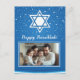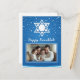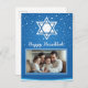 This Hanukkah greeting card beautifully combines tradition and personalisation. The card features a large Star of David against a night sky backdrop, dotted with stars, creating a serene and festive atmosphere. The “Happy Hanukkah!” message is prominently displayed, making it clear and celebratory. Below the greeting, there’s a framed photo area where you can insert a personal photograph, adding a unique and heartfelt touch.