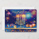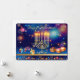 Happy Hanukkah Beautiful Jewish Holiday Greeting Card / Invitation. Jewish Holiday Hanukkah Vintage Jerusalem gold frame, navy blue background with traditional Chanukah symbols - Gold Menorah, Hanukkiah Candelabrum and Candles, wooden dreidels (spinning top), donuts, star of David and glowing lights wallpaper pattern. Hanukkah Festival Decoration. Jerusalem, Israel. Invitations & Stationery > Greeting Cards > Holiday & Seasonal Cards > Hanukkah Cards beautiful card with two sides graphic decoration. Card Design with custom text template. Vintage design. Personalize them by adding or change invitation text.