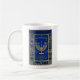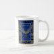 Happy Hanukkah Beautiful Jewish Holiday Festival of lights, celebration. Jewish Holiday Hanukkah Vintage Jerusalem. gold ornamental decorative golden frame, navy blue background with traditional Chanukah symbols - Gold Menorah, Golden Hanukkiah Candelabrum and Candles, star of David and glowing lights wallpaper pattern. Hanukkah Festival Decoration, celebrate Winter Anniversary. Perfect gift for him, for her, family party, friends, classroom event, Jerusalem, Israel. Home & Living > Kitchen & Dining > Drinkware > Mugs & Cups