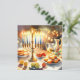 Hanukkah watercolor illustration. A beautifully arranged table set for a festive celebration, featuring a traditional menorah with lit candles. Soft, warm light, while holiday decorations add a touch of cheer. Warm lights creating a cosy, inviting atmosphere.