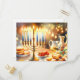 Hanukkah watercolor illustration. A beautifully arranged table set for a festive celebration, featuring a traditional menorah with lit candles. Soft, warm light, while holiday decorations add a touch of cheer. Warm lights creating a cosy, inviting atmosphere.