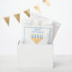 Cute custom Happy Hanukkah party favour bag for a Jewish family or a Chanukah party with a synagogue. Personalise with your own last name or group information in blue under the pretty gold menorah in blue script.