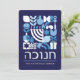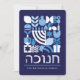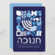 Hanukkah / Chanukah Blue White Modern Geometric Pattern Card with Faux Silver Foil. Menorah, Dreidel, Doughnuts, Stars & Olive oil... Hebrew & Jewish Hanukkah Symbols + Space to add your personalised text on the front & reverse. Happy Hanukkah wishes. Hebrew on the front says "Chanukah". This upscale, beautiful, look, is a great way to wish friends, family, and clients, a very Happy Hanukkah/Chanukah. If you want to see a variation of this design please message us or email BestDressedBread@gmail.com.