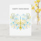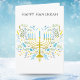 This elegant Happy Hanukkah card design features a radiant golden menorah glowing brightly at the center, each blue and white candle symbolizing light, hope, and celebration. Surrounding the menorah is an intricate symmetrical arrangement of leaves, branches, and delicate flourishes in shades of blue, green, and gold creating a modern folk-art look with a touch of cottage charm. Tiny stars, doves, books, and festive motifs are woven among the foliage, adding layers of meaning that reflect faith, peace, and tradition. The deep, dark background enhances the warmth and brilliance of the menorah’s light, making it appear as though it glows from within. Perfect for sending blessings of peace, joy, and light during the Festival of Lights, this card beautifully combines contemporary artistry with timeless Hanukkah symbolism.