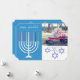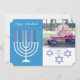 A white menorah with colourful candles and a Happy Hanukkah sentiment is paired with three hanging stars of David to create this joyful holiday card. Just add your photo to make it yours. Vecteezy Jewish Candlesticks.