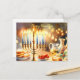 Hanukkah watercolor illustration. A beautifully arranged table set for a festive celebration, featuring a traditional menorah with lit candles. Soft, warm light, while holiday decorations add a touch of cheer. Warm lights creating a cosy, inviting atmosphere. Designed by artist Danguole Serstinskaja.