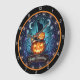 Wish everyone a "Happy Haunting" with this mystical round design. It features a black cat with bright green eyes perched atop a stack of glowing jack-o'-lanterns. The spooky scene includes crescent moons, stars, bats, and glowing mushrooms, all set within a pumpkin-themed border. A perfect Halloween accent piece.