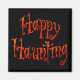 "Happy Haunting" text in spectral orange letters, with a few ghostly eyes, a humourous design for a haunting Halloween.