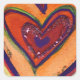 A small purple heart is enclosed by a red heart that is within orange hearts. The hearts are outlined in green, purple, and red. The watercolor background is a soft yellow with colourful confetti dots. A light layer of gold and red glitter traces the heart edges. Painting detail from Inspirational Word "Happy" artwork. Customise the heart art painting love stickers with your text to make it a personalised hearts sticker gifts for someone special to how your love!