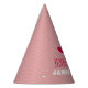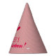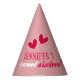 Happy Hearts Sweet Sixteen Birthday party hat features two pink hearts on a diagonally striped pink background along with custom text. © Morning 6