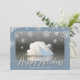 This Happy Holiday greeting card has a photograph of a lovely mute swan on a lake with a snowflake overlay and a blue border. Personalise with your name and year.
