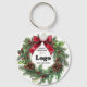 Custom "Happy Holidays" keychain for clients with your business logo, a festive wreath, and a red bow. Company promotional supplies for the Holidays, you can order in bulk for your employees or as branding and marketing supplies to promote your store.