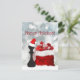 This festive, chess Christmas card design features a winter snow scene with a chess piece wearing a Santa hat with a beautiful bag of presents. Features the phrase "Happy Holidays!".