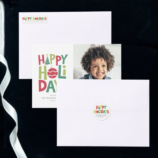 This festive holiday envelope features fun, colourful lettering and coordinates with the Colourful wishes holiday photo card. In red, lime and green with playful illustrations, it sends merry and bright holiday cheer. The back flap features the bright "Happy Holidays" along with your return address. The front features a matching "to."