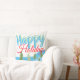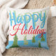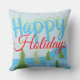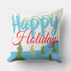 Happy holidays pillow design with trees. Colours are reds, blues and green. The text can be personalised to any message.
